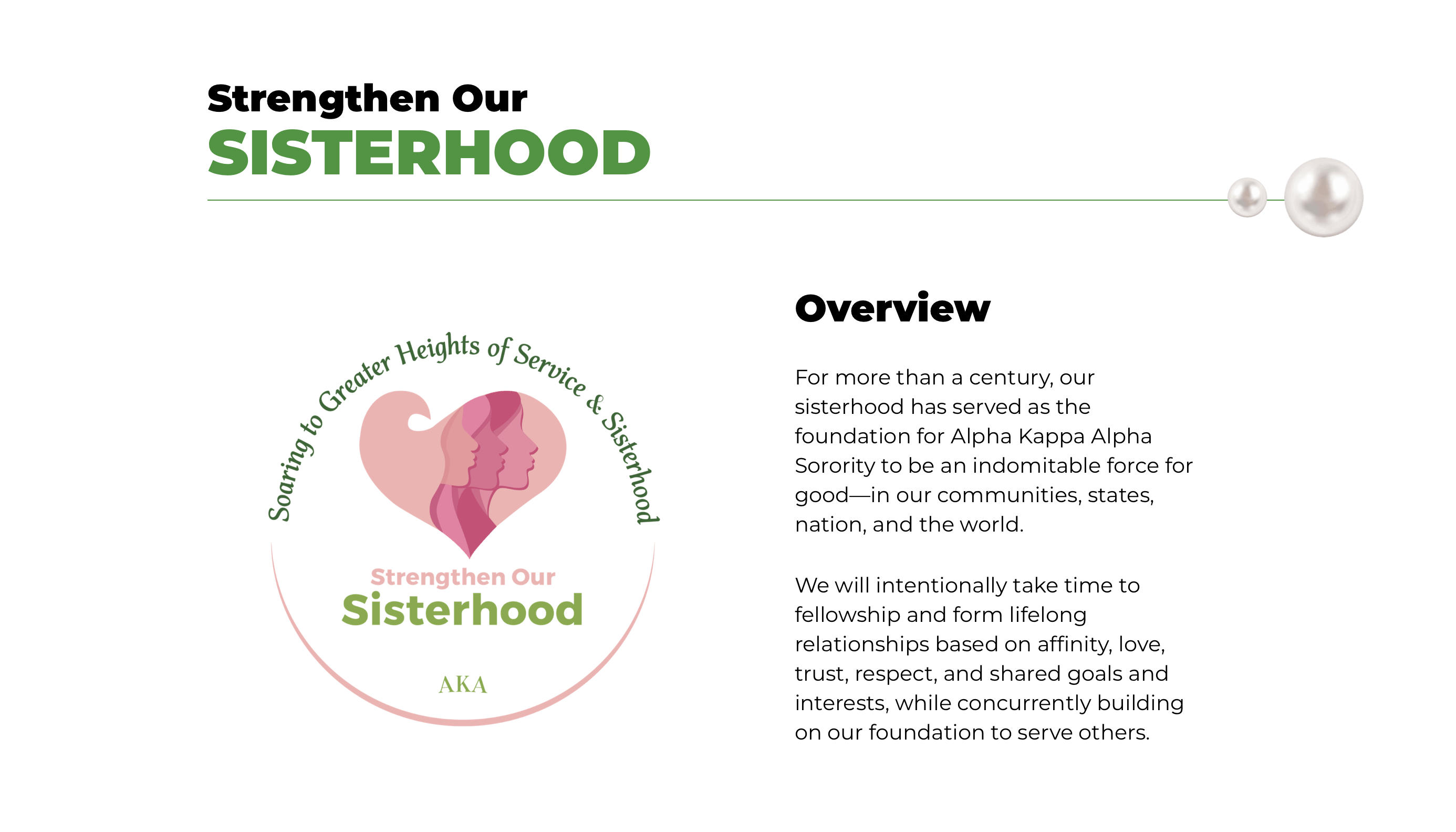 Service and sisterhood have been the cornerstone of Alpha Kappa Alpha Sorority, Inc.® since 1908. With the theme, Soaring to Greater Heights of Service and Sisterhood, the 2022-2026 administration seeks to build upon Alpha Kappa Alpha Sorority’s rich legacy of service by galvanizing our sisterhood of more than 120,000 active members to lead on the front lines of change, education, and advocacy.
